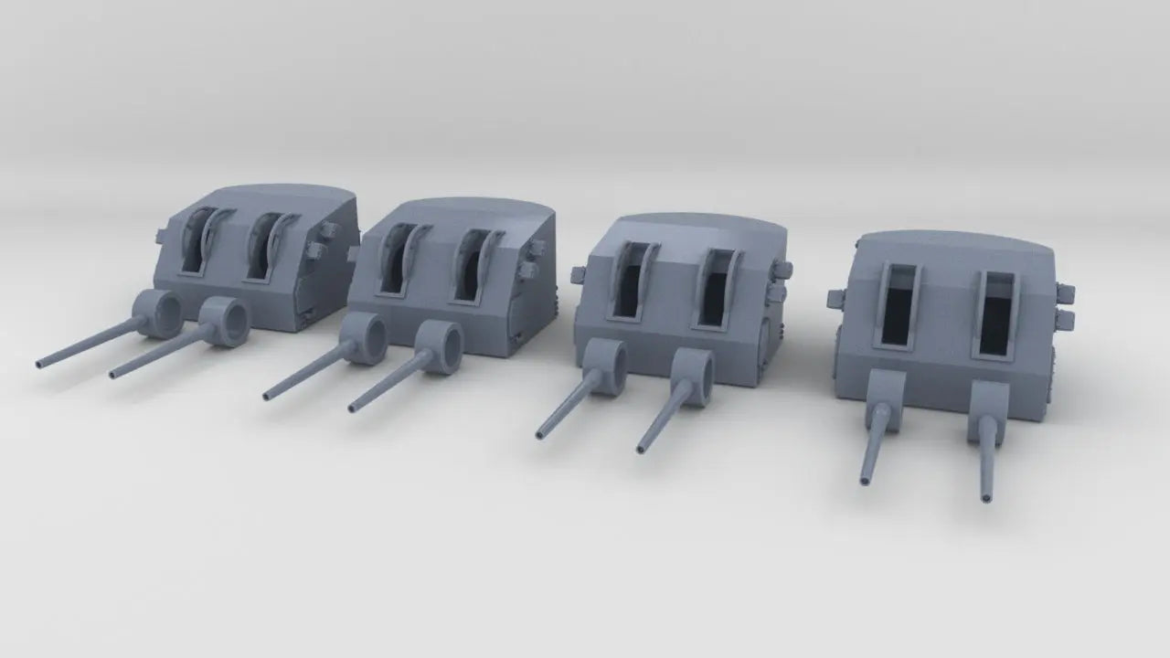 Add a touch of sophistication to your model ships with this 1/240 USN 5"/38 Cal. Mk. 12 twin mount set. Crafted with meticulous attention to detail and accuracy, each barbette mount, likely produced in High Detail Resin Grey, is ready to give your model ships the exact look of the real USS Massachusetts BB-59, South Dakota BB-57, Indiana BB-58, Alabama BB-60, and Iowa BB-61. Unpainted and hollowed to save material, this set of 4 will give your 1/240 scale models a touch of premium elegance and historical realism.